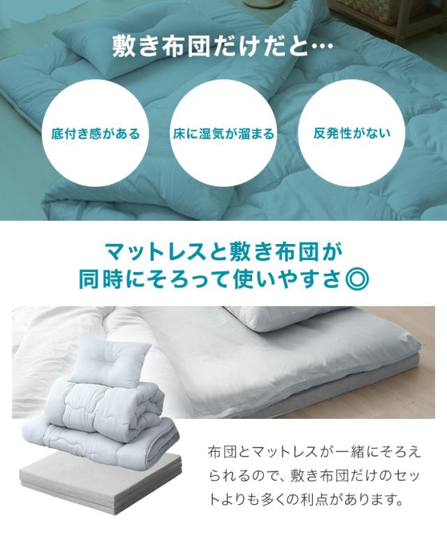 届いてすぐ使える寝具3点+収納ケース+マットレスの5点セットです。