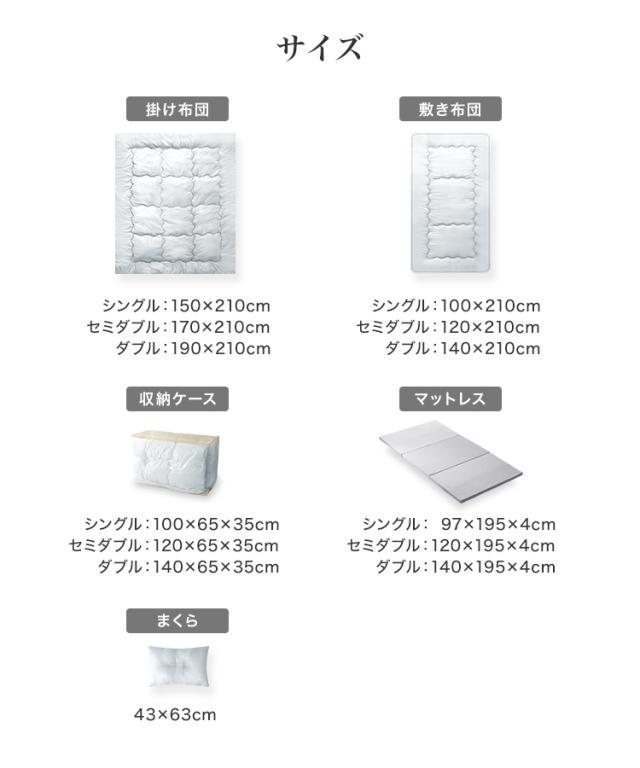 敷布布団:(約)140×210cm 収納ケース:(約)140×65×35cm まくら:(約)43×63cm マットレス:(約)140×195×4cm |