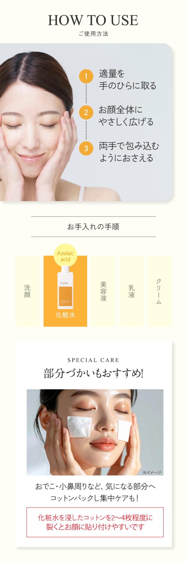 洗顔後、適量を手に取り、肌になじませます。