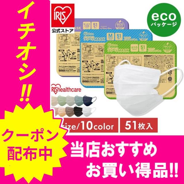 \100円OFFクーポン!~12/19 9:59/マスク 不織布 大容量 51枚 アイリスオーヤマ アイリスヘルスケア 小さめ ふつう 大きめ 不織布マスク 白 カラー おしゃれ プリーツマスク カラーマスク プリーツ 使い捨て 不織布プリーツマスク 風邪 花粉 対策 ecoパッケージ PN-51 *