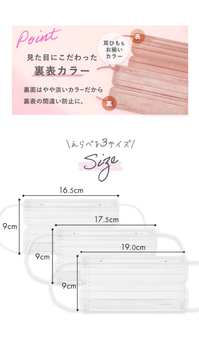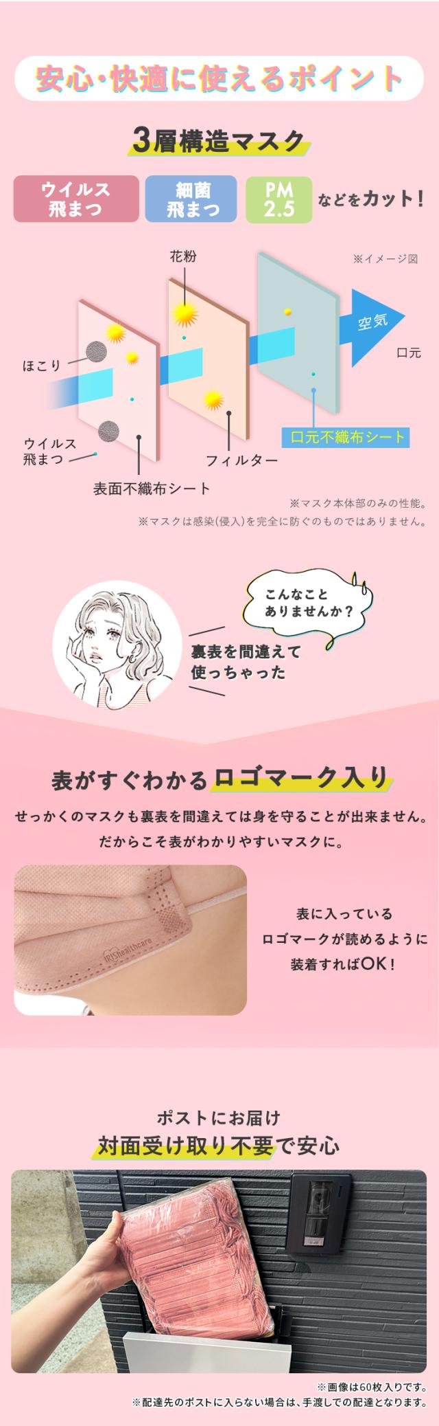 3層構造(表面不織布シート/フィルター/口元不織布シート)で、花粉・ウイルス飛沫・細菌飛沫・PM2.5などをカットします(※)。