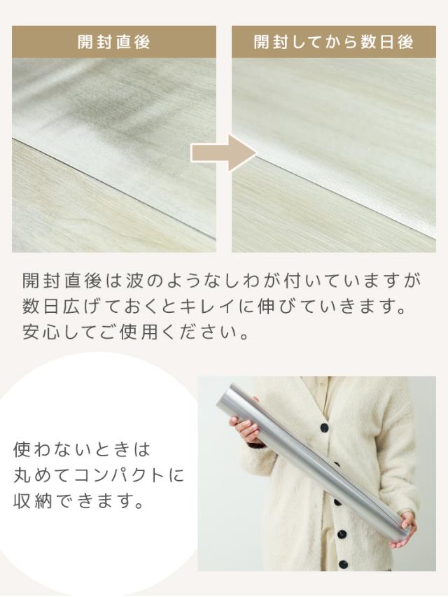 ・ゴム製品やゴム脚が付いた物を置くと、跡がつく場合があります。 ・直射日光、温度、湿度によっては、製品の変色、伸縮、反り返りが発生することがあります。 ・筒状に巻いた状態でのお届けとなります。室温20〜25℃で広げていただきますと、巻きグセは1日ほどでとることができます。なかなか巻きグセが取れない場合には、逆方向に巻いていただくと巻きグセがとれやすくなります。 ・お手入れは薄めた中性洗剤を湿らした布につけ、固く絞って拭いた後、水分が残らないように乾いた布で乾拭きしてください。 ・日の当たる所で使用しないでください。日焼けで硬化する場合があります。 ・仕様・デザインは改良のため予告なく変更することがあります。 |