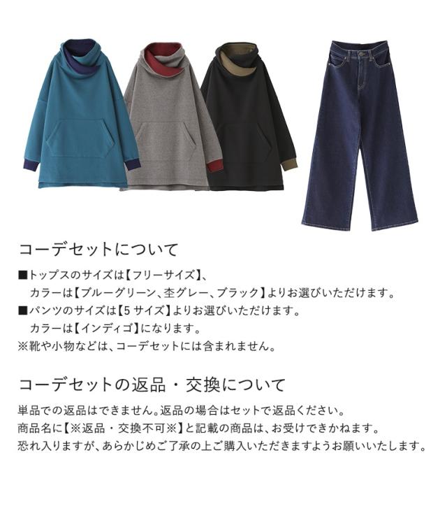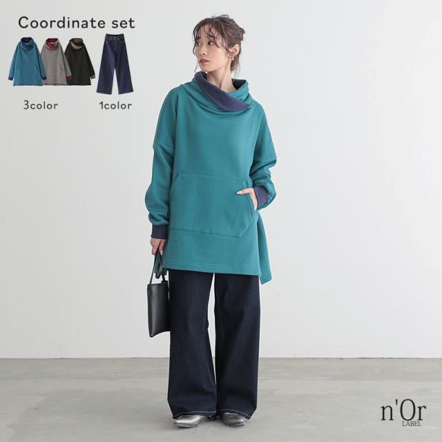 【送料無料】『配色スタンドネック裏起毛チュニック×ストレートワイドパンツコーデ2点SET』【メール便不可】【60】[2点コーデセット 2025 レディース トップス トレーナー スウェット ボトムス パンツ ロングパンツ]