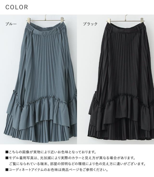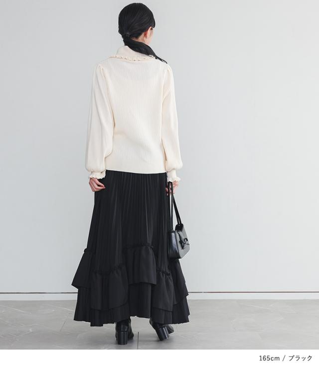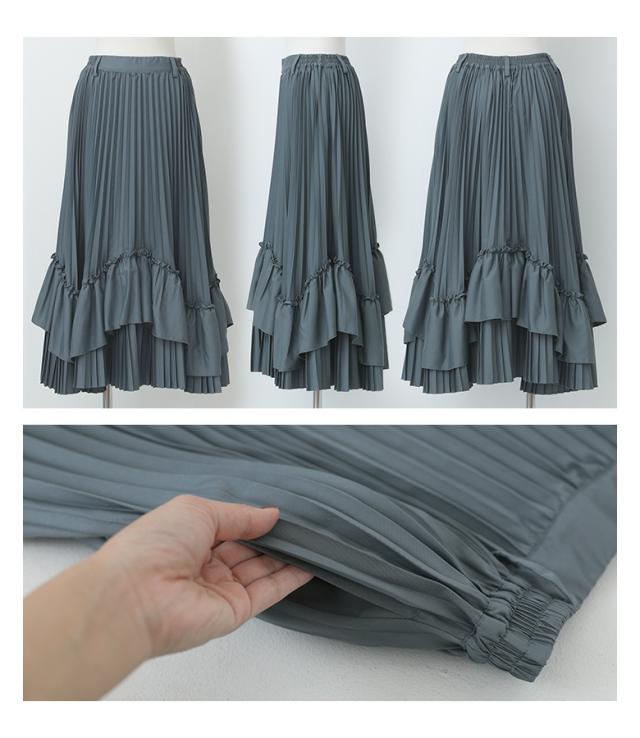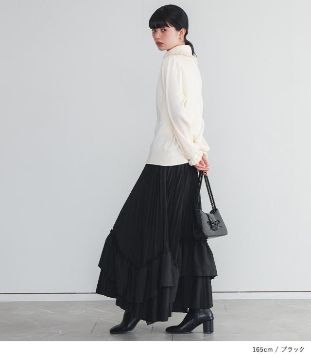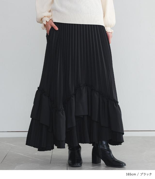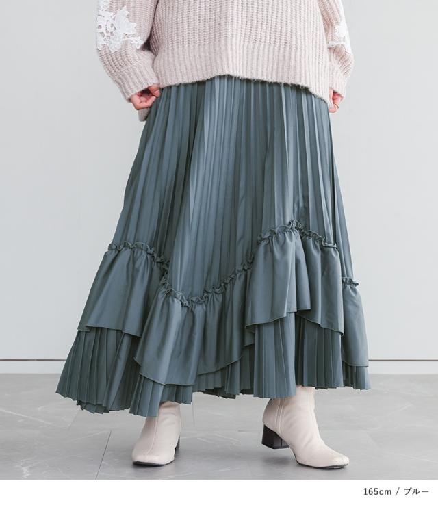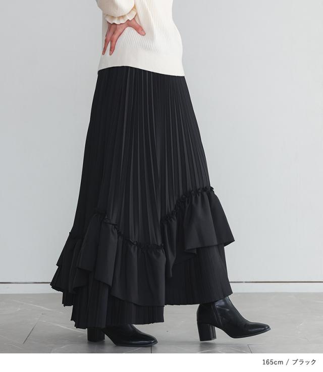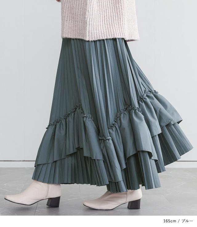 <冬新作>『ティアードプリーツスカート』【メール便不可】【40】[スカート ロング丈 レディース ボトムス プリーツスカート フリル ティアードスカート 裏地付き ウエストゴム 秋 冬]