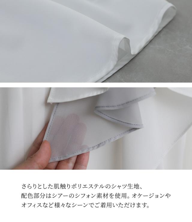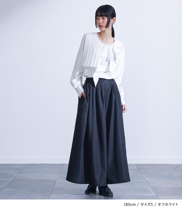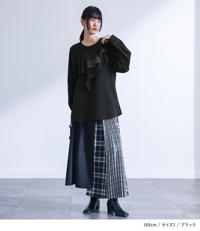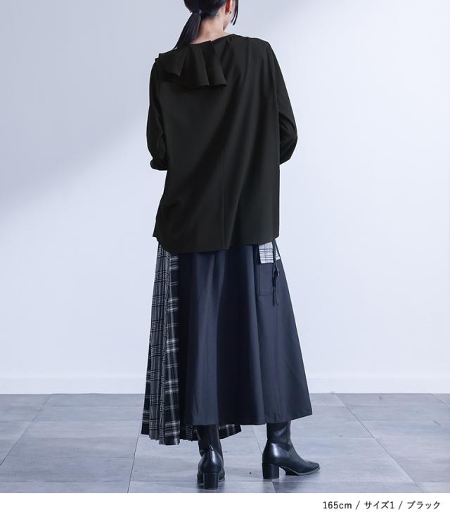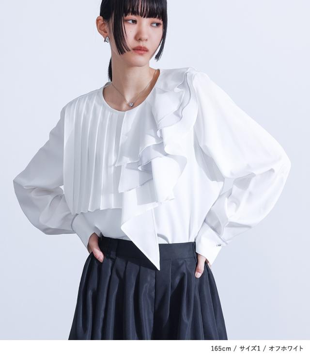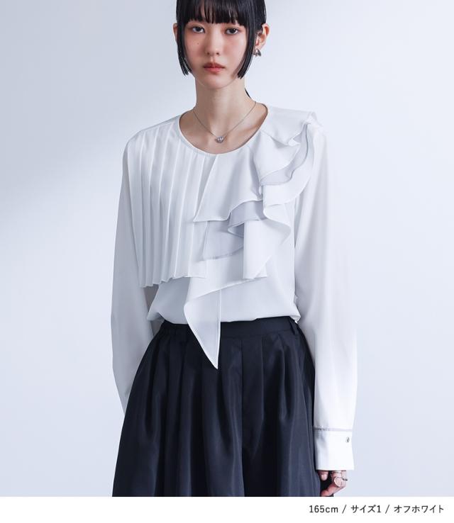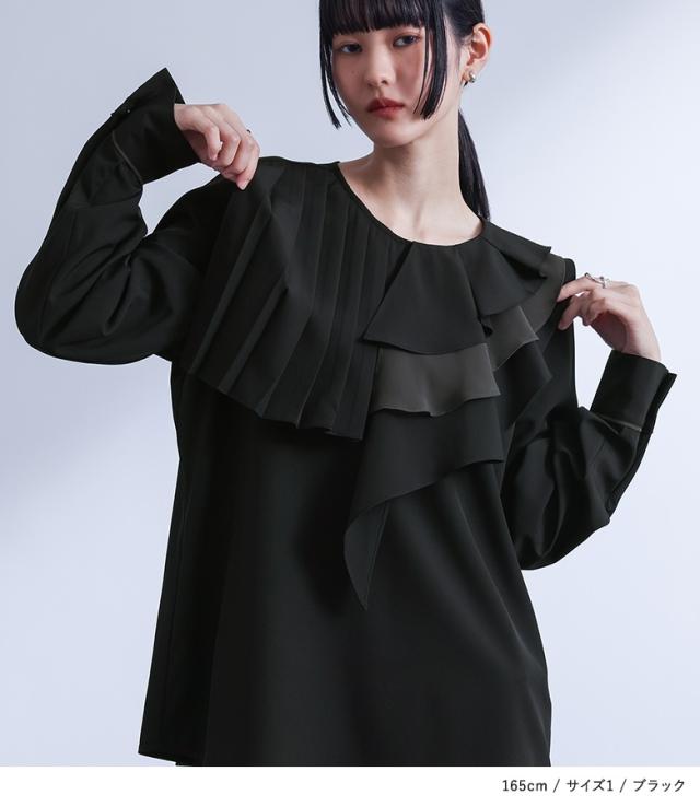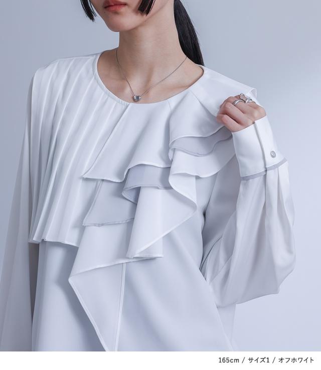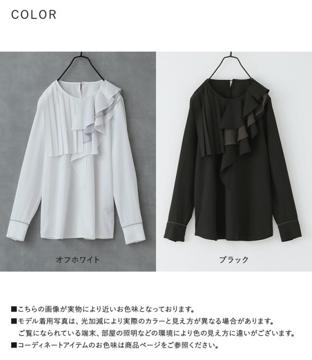 ブラウス 長袖 レディース トップス フリル プリーツ 異素材 シアー 配色 アシンメトリー アシメ プルオーバー オケージョン 秋 冬 【TP】 シャツ クルーネック ホワイト 白 オフホワイト ミディ丈 ミドル丈 チュニック丈 無地 シフォン 透け感 レイヤード 重ね着 おうちで洗える 春 夏 オールシーズン カジュアル シンプル モード マニッシュ キレカジ フェミニン ゆったり ゆる 楽ちん S M L LL 3L XL ぽっちゃり 体型カバー 大きいサイズ プラスサイズ 10代 20代 30代 40代 50代 60代 低身長 高身長 女子会 オフィス 通勤 通学 お買い物 お出掛け 旅行 リゾート おしゃれ お洒落 トレンド 流行 パーティー 二次会 結婚式 入学式 卒業式 フォーマル セレモニー 謝恩会 学校行事 お宮参り 七五三 ママ 母 母親 ママスーツ kOhAKU コハク 大人女子 大人可愛い お洒落可愛い 大人カジュアル ラフ スタイリッシュ 洗練 エッジィ 上品 きれいめ かっこいい osharewalker オシャレウォーカー おしゃれうぉーかー ブラック 黒[ID]15to0pl[kOhAKU異素材配色プリーツブラウス]