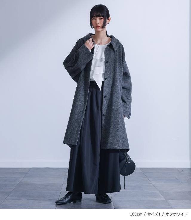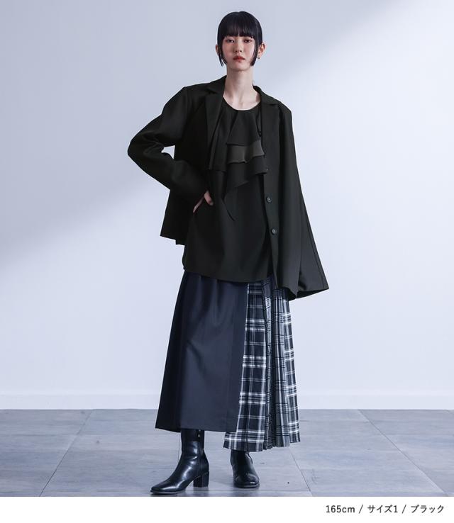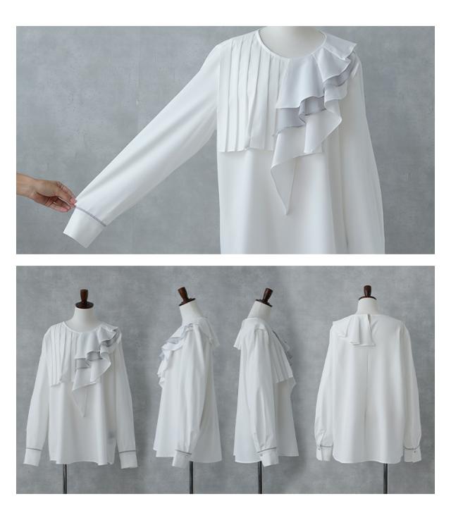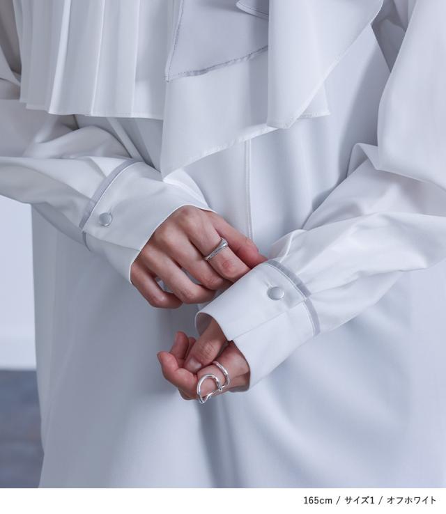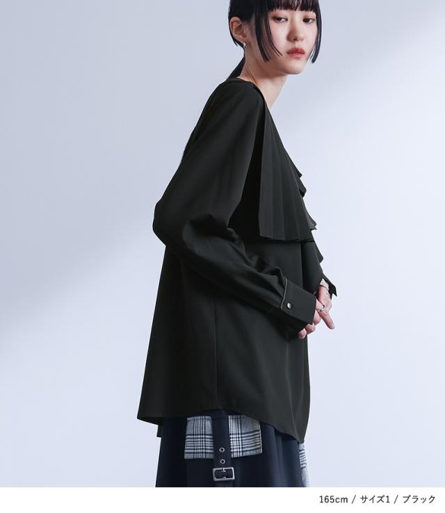 ■デザイン 左右で異なる表情を楽しめるアシンメトリーな襟が主役のブラウス。 右襟には繊細なプリーツ、左襟にはフリルにシアー素材を重ね、動きと軽さを演出しています。 さらに袖口にも襟と同じ異素材の配色ラインを施し、さりげないアクセントに。 一枚でスタイリングの主役になる、デザイン性の高い一着です。 ■コーディネート シンプルなボトムスと合わせれば、襟のディテールが引き立ち、上品で洗練された印象に。 ワイドパンツや柄スカートなど、デザイン性のあるボトムスと合わせてもバランスよくまとまり、 きちんと感のある通勤スタイルから、お出かけシーンまで幅広く活躍します。 ジャケットインでも襟元の華やかさが際立つため、レイヤードスタイルにもおすすめです。 ■製品についての注意書き この製品はプリーツ加工を施していますが永久的なものではなく、着用や水洗い、クリーニングを繰り返す事によりプリーツが消失する恐れがあります。 洗濯はネットを使用し、脱水は短時間で処理し直ちに干してください。 ご了承の上、ご購入いただきますようお願いいたします。 |