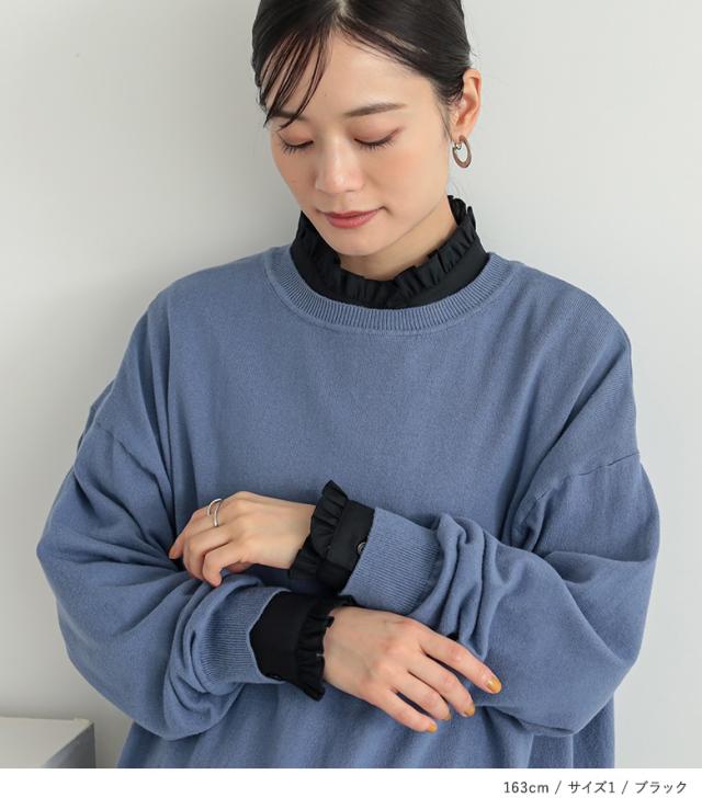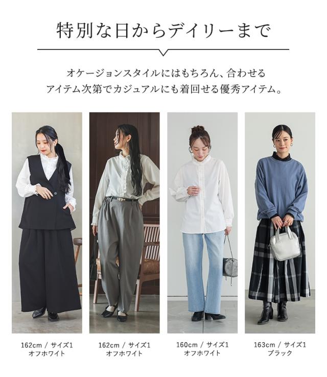 | staff:P/161cm B98 W82 H99 【普段着用】 Tops: LL Bottoms:LL | 【1】 袖丈:手首位 着丈:ヒップ真ん中位 腕周り:ジャスト バスト:ジャスト 全体:ジャスト 肩と腕まわりが少しタイトに感じました。 【2】 袖丈:手の甲が隠れる位 着丈:ヒップ下少し見える位 腕周り:ゆったり バスト:ゆったり 全体:ゆったり 窮屈さは感じずゆったり着用できました。ニットの中にレイヤードしても、オケージョンにも使えるブラウスなので、一枚持っておくと便利です。 私の場合は、2を選びます。 |
