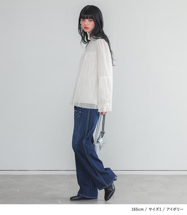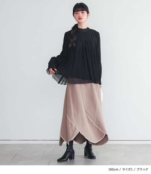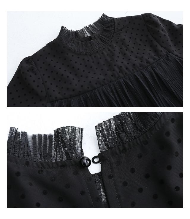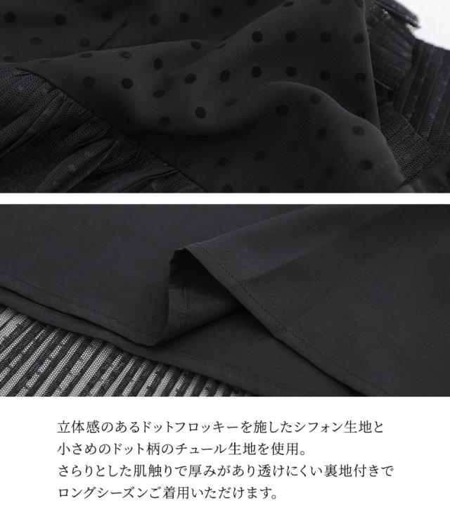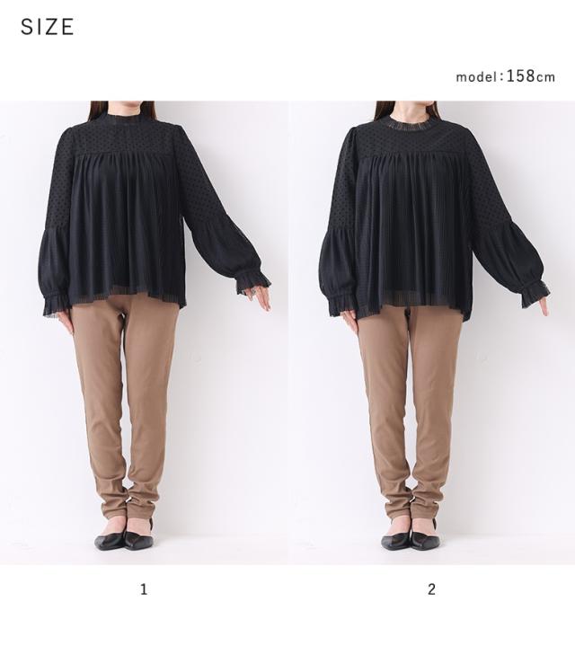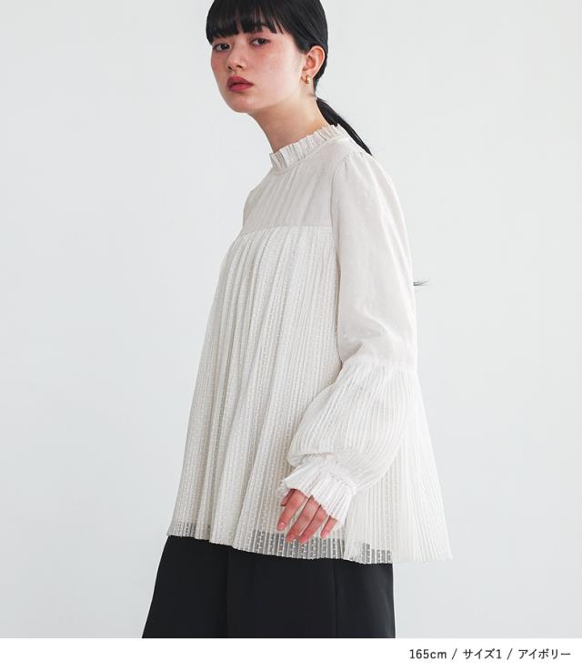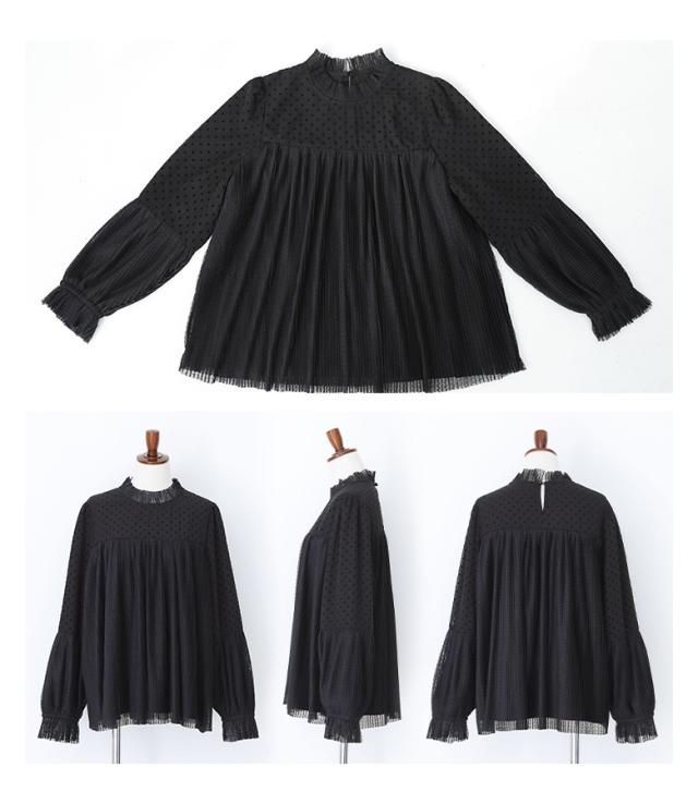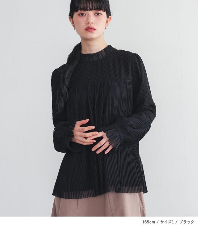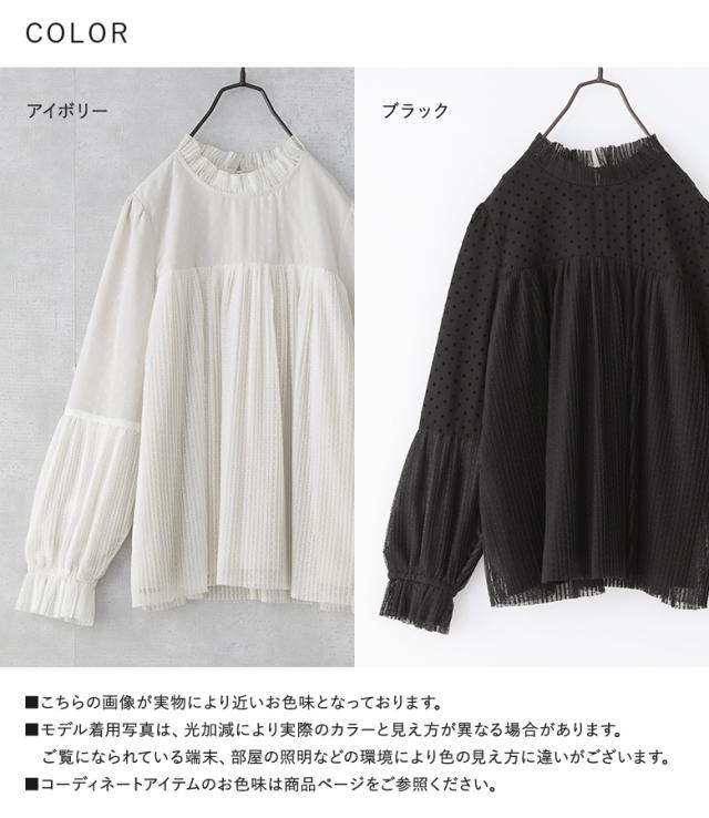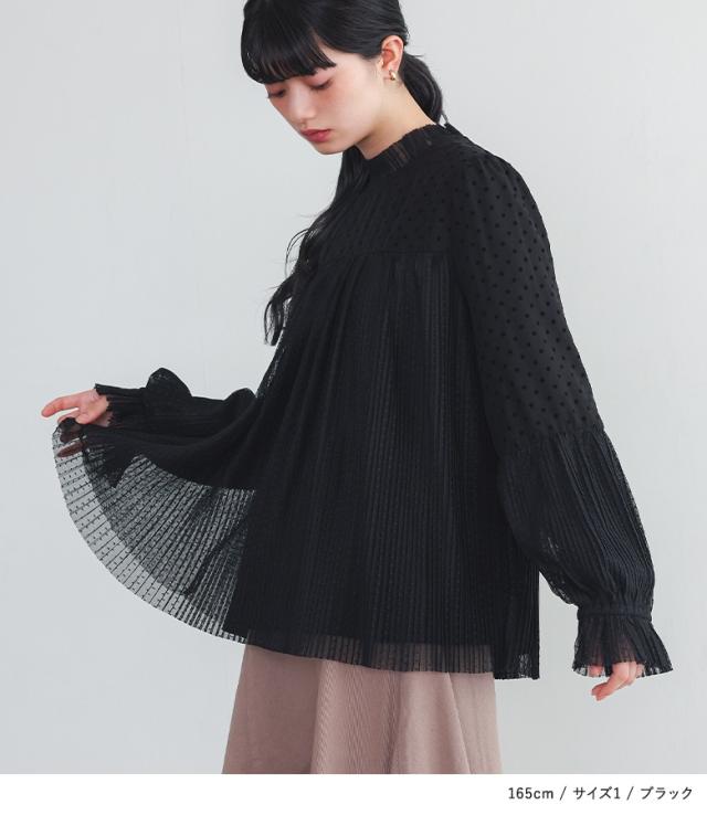 <冬新作>『ドットチュールブラウス』【メール便不可】【20】[ブラウス 長袖 レディース トップス プリーツ ドット柄 チュール 透け感 シアー 裏地付き スタンドカラー オケージョン 春 夏 秋 冬]
