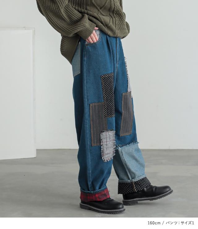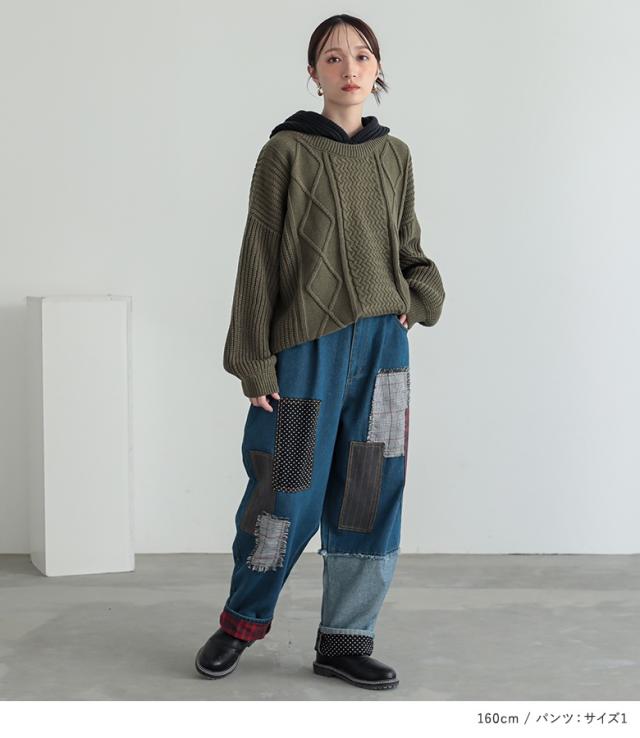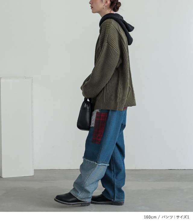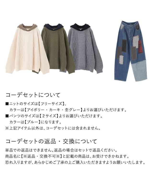 【送料無料】『パッチワークデニムパンツ×ケーブル編みフードニットコーデ2点SET』【メール便不可】【50】[2点コーデセット 2025 レディース デニム パンツ ボトムス ロング丈 ジーンズ ニット 長袖 セーター]
