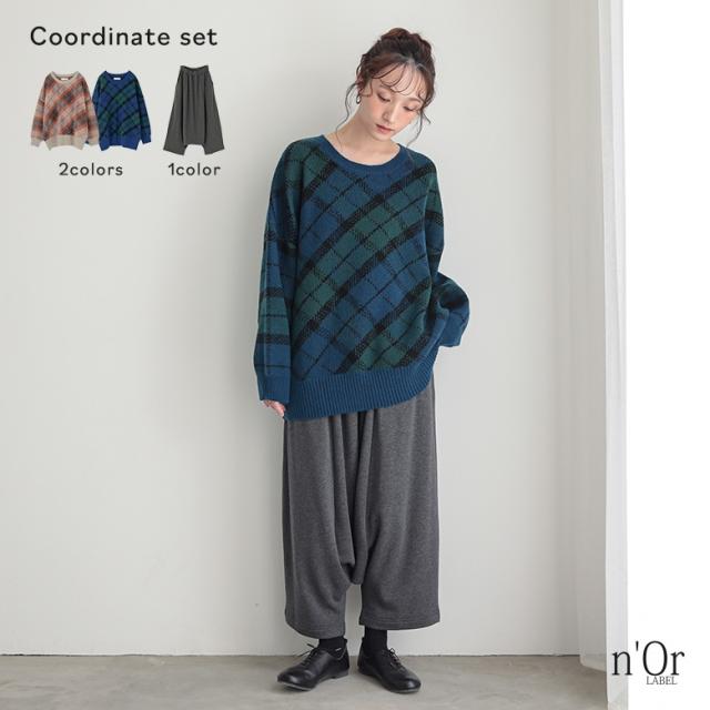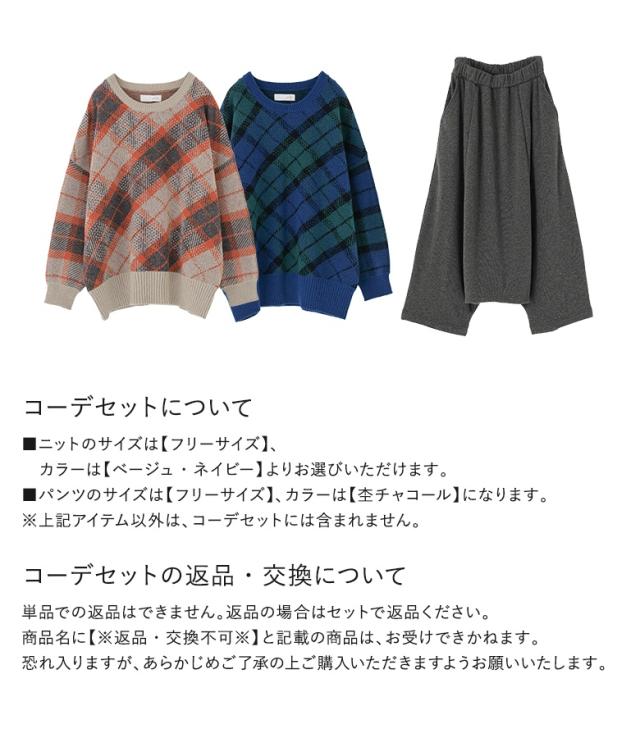『チェックジャカードニット×裏シャギーサルエルパンツコーデ2点SET』【メール便不可】【50】[2点コーデセット 2025 レディース ニット 長袖 トップス セーター サルエルパンツ 裏シャギー あったか ボトムス]