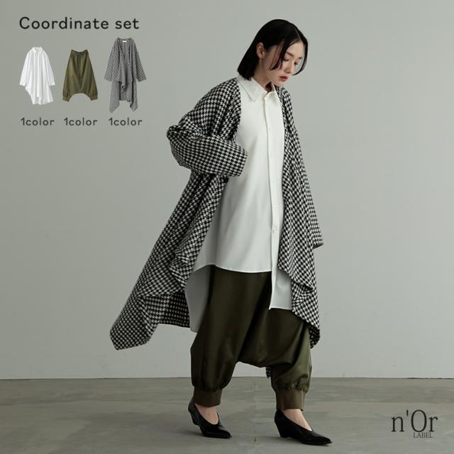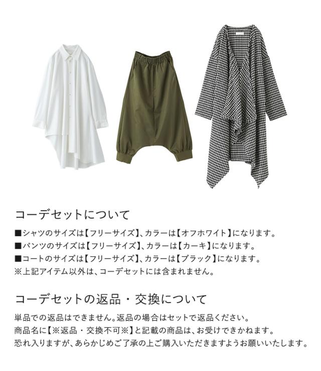 【送料無料】『裾リブサルエルパンツ×左フレアーシャツ×前ヒラヒラドレープ羽織コーデ3点SET』【メール便不可】【70】[3点コーデセット 2025 レディース パンツ サルエルパンツ シャツ 襟付き ポンチョ コート]