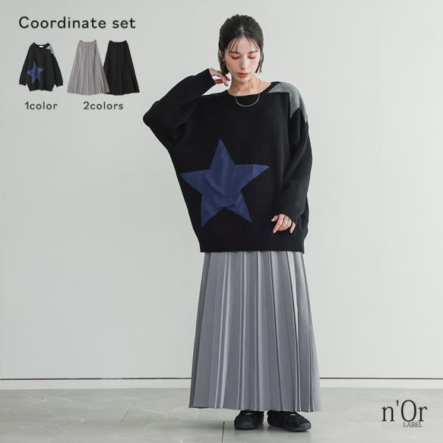 【送料無料】『星柄フクレジャカードニット×ボンディングプリーツスカートコーデ2点SET』【メール便不可】【60】[2点コーデセット 2025 レディース ニット 長袖 トップス セーター スカート ボトムス ロング丈]