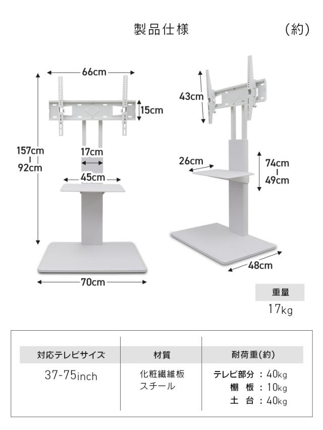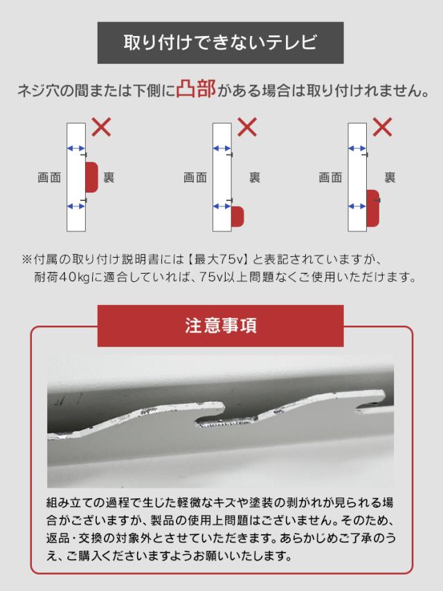 | 耐荷重 | テレビ取り付け部40kg 棚板10kg 土台40kg |