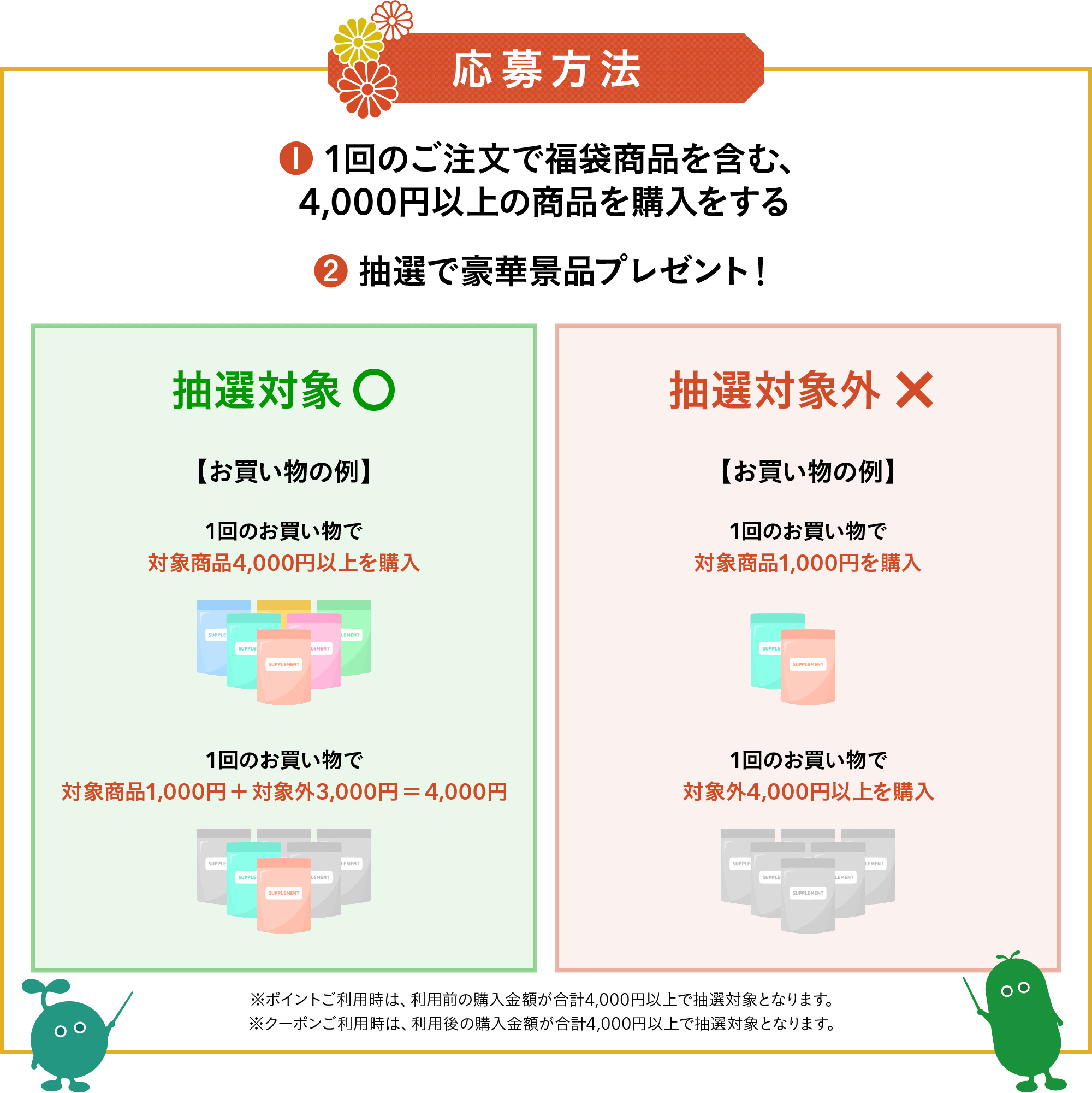 ・ポイントご利用時は、利用前の購入金額が合計4,000円以上で抽選対象となります。